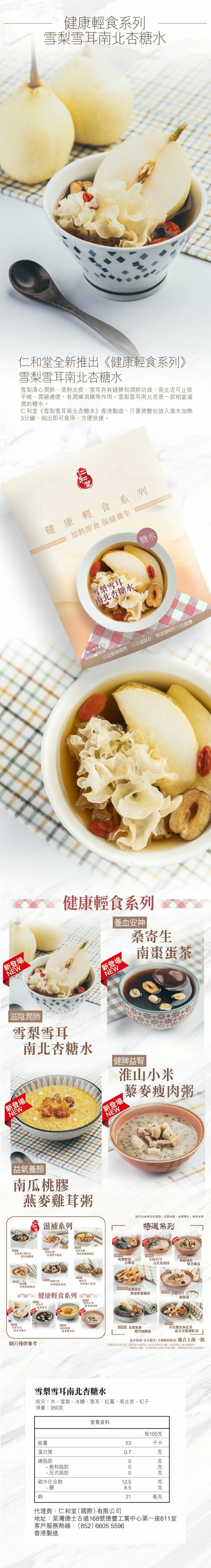 雪梨清心潤肺,清熱去痰;雪耳亦有健脾和潤肺功效,南北杏可止咳平喘,潤腸通便,有潤燥清積作用。雪梨雪耳南北杏糖水是一款相當滋潤的糖水。《仁和堂雪梨雪耳南北杏糖水》香港製造,只要將整包放入滾水加熱3分鐘,倒出即可食用,方便快捷。