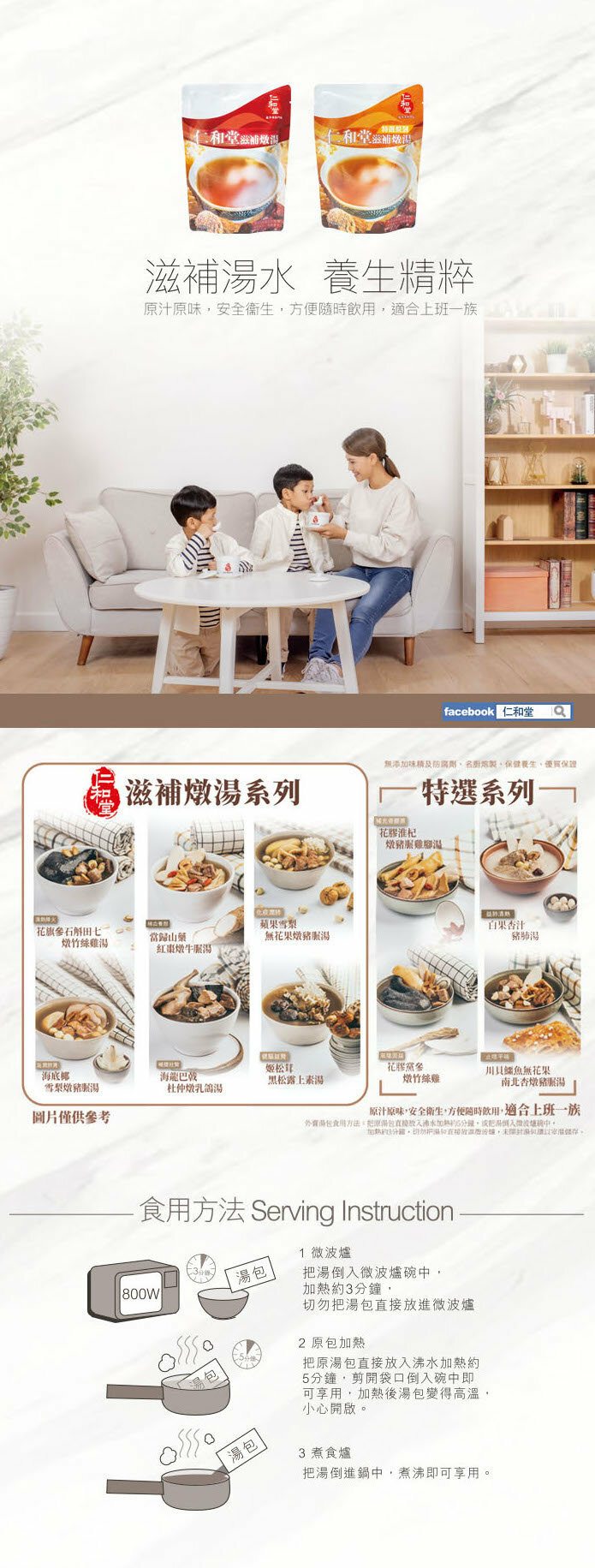 仁和堂滋補燉湯可以套票或現貨形式購買,只限換領42元湯款、糖水及粥,「特選系列」湯包須補差價。