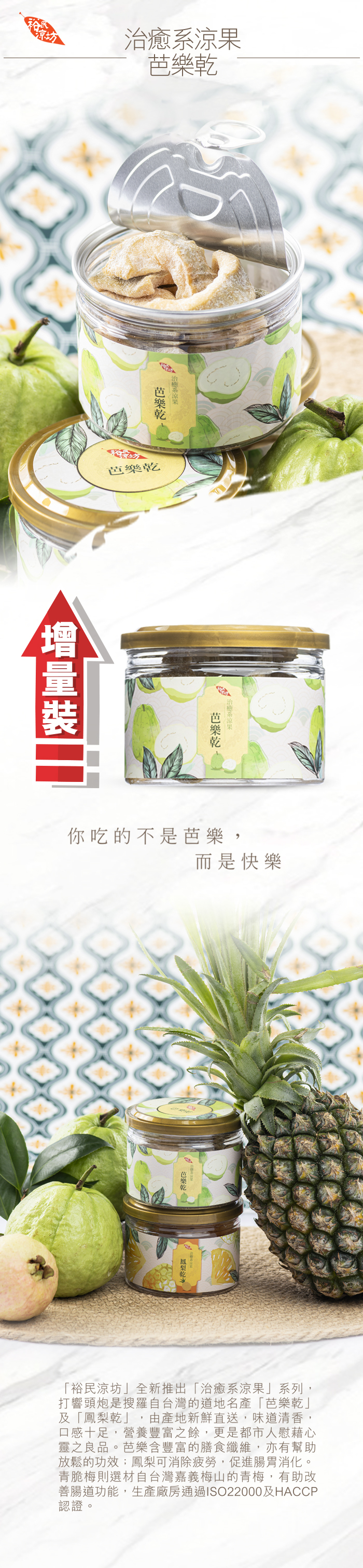 「裕民涼坊」全新推出「治癒系涼果」系列,打響頭炮是搜羅自台灣的道地名產「芭樂乾」及「鳳梨乾」,由產地新鮮直送,味道清香,口感十足,營養豐富之餘,更是都市人慰藉心靈之良品。芭樂含豐富的膳食纖維,亦有幫助放鬆的功效;鳳梨可消除疲勞,促進腸胃消化。生產廠房通過ISO22000及HACCP認證。