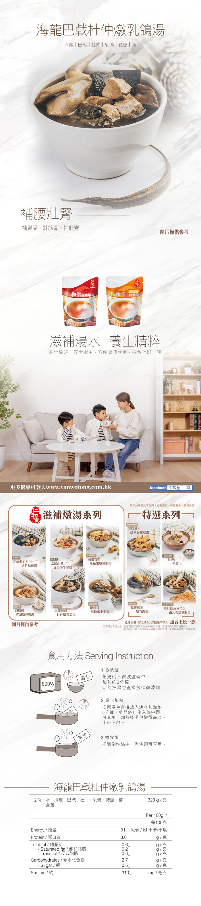 成份:水、乳鴿、豬展、巴㦸、杜仲、海龍、薑、食鹽